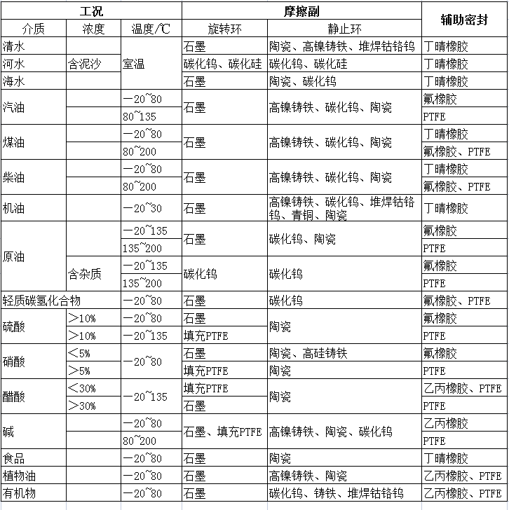 機械密封按工況和介質的不同,有耐高溫、耐低溫機械密封,耐高壓、耐腐蝕機械密封,耐顆粒介質機械密封和適應易汽化的輕質烴介質的機械密封等,應根據不同的工況選取不同結構型式和材料的機械密封。見下圖: