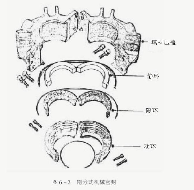 為了便于拆裝維修時保證密封面平行,利用將零件做成分塊的剖分式機械密封- 。這種密封可以做成周向?qū)﹂_或多瓣環(huán)用圍簧箍住。 圖6-2所示為一種剖分式機械密封。這種密封的壓蓋、動環(huán)、動環(huán)座、靜環(huán)和輔助密封圈均做成有接縫的對開環(huán)和開口密封圈。開口密封環(huán)兩端做成球窩對接。這種密封安裝方便、速度快,停機時間縮短。如同軟填料密封的填料那樣,不用拆卸泵或聯(lián)軸器,就可以快速拆裝。但目前還存在密封環(huán)能否長期、重復(fù)使用和保證密封的問題。