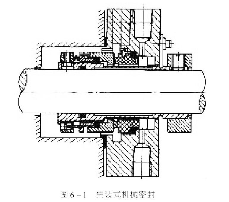 圖6-1 所示為一種集裝式機械密封,又叫卡式密封。這種密封的靜環(huán)、動環(huán)、軸套與壓蓋和輔助密封在安裝前用一軸套都集裝在一起,便于檢查裝配質(zhì)量。檢查合格后只要把緊密封蓋、固緊螺釘即可。這樣事先組裝、檢查和試驗的密封組件,容易保證安裝和裝配質(zhì)量。 這種集裝式密封具有下列特點: 1)安裝時無需測量密封工作長度; 2)軸可以隨時調(diào)整; 3)不會發(fā)生啟動時泄漏問題,因為密封件已預(yù)先測試過; 4)安裝時只需套裝把緊密封蓋螺栓,裝配質(zhì)量容易保證; 5)在安裝或起動以前保護密封面不受雜物污染或因操作失誤而損壞; 6)機器設(shè)備熱膨脹后可以重調(diào); 7)利用配合可以自定中心; 8)容易取出密封件清洗和檢查,而無需拆卸機泵設(shè)備。 API 682標準中推薦了所有機械密封采用集裝式機械密封。